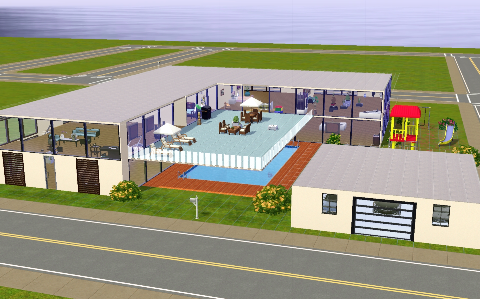 After that, I hope to do some girly lots. Girly usually makes me itch so it should be interesting to see how girly I can get. I take way too much time doing lots now but it's all the options I always wanted. I just play around with it a lot. What? It's a stressbuster for me. I can't help it I blow 6 hours changing the colors of walls and fussing with roof slopes. You get nice, flat lots with practical layouts and sensible furnishings. I could make a box if you want. Everyone else does. It's called "modern". LOL I may someday just to be like everyone else, but what fun is that? A flat roof would be a nice change...
