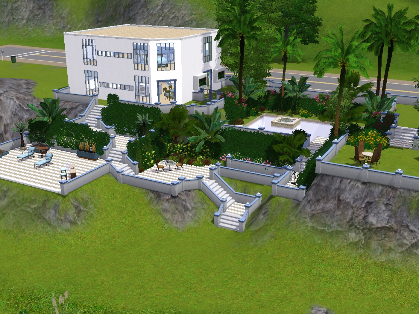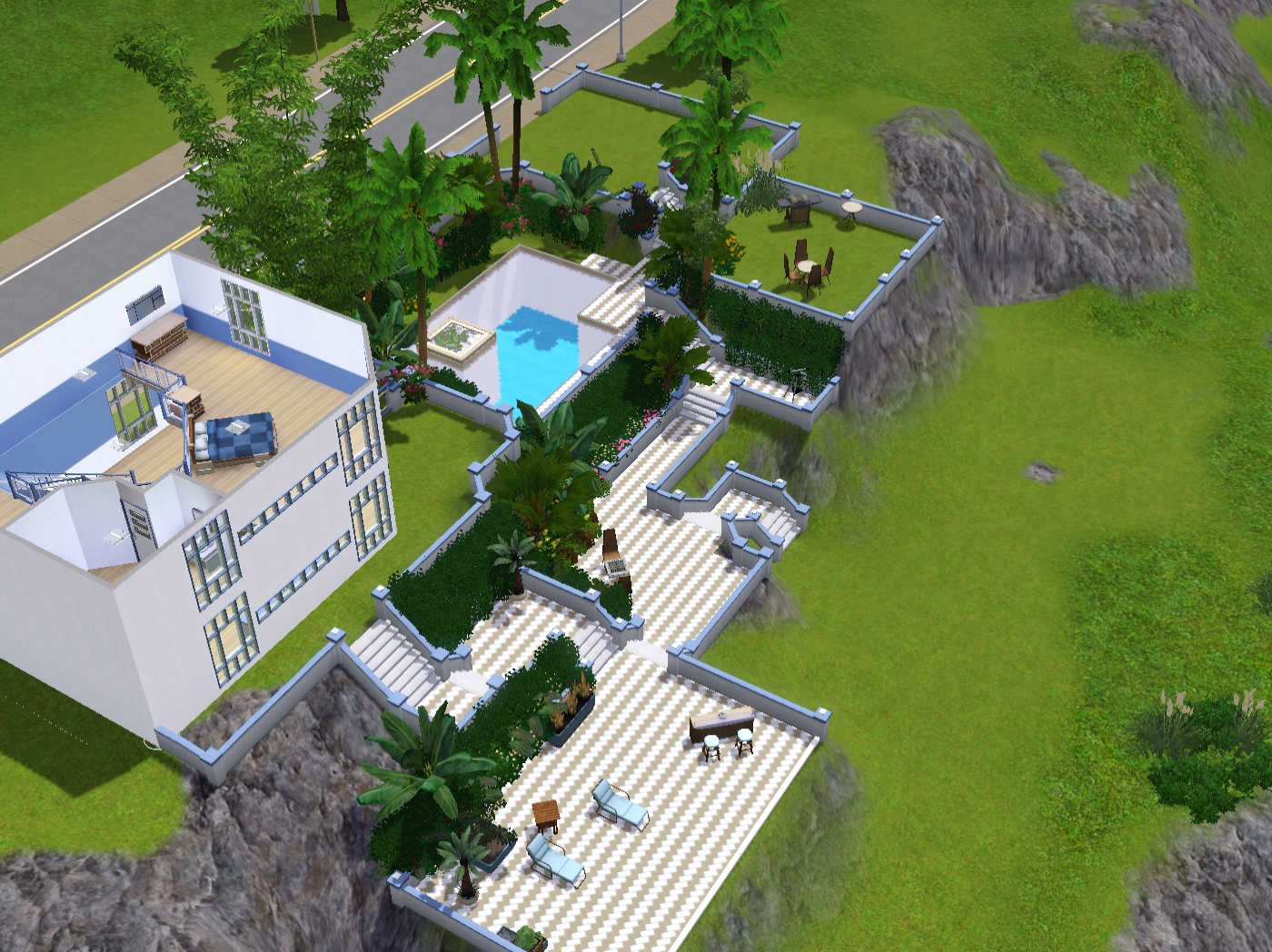 ...I wanted to build something at 120 Wright Way, mainly because it looked like a bit of a challenge as its on a hillside. I fiddled around with it for a while as I didn't really have any firm ideas in my head apart from outside dining, and this is what I eventually came up with...it has several terraces, as i discovered that when you place stairs on the ground you can create them on two seperate angles and levels...I've only been playing this since it came out so I don't know why it's taken me so long to discover it :-D ...anyway, some pics...