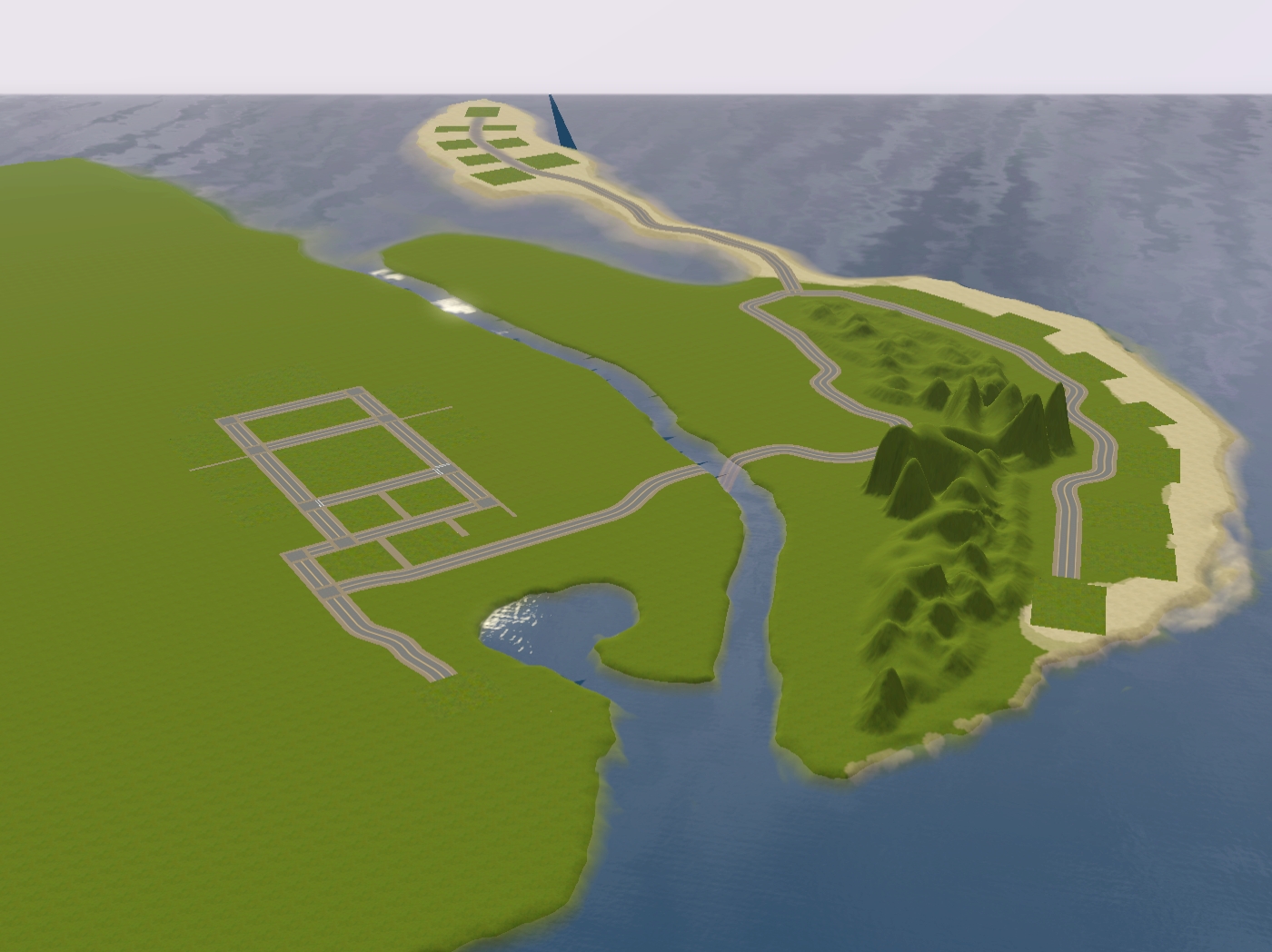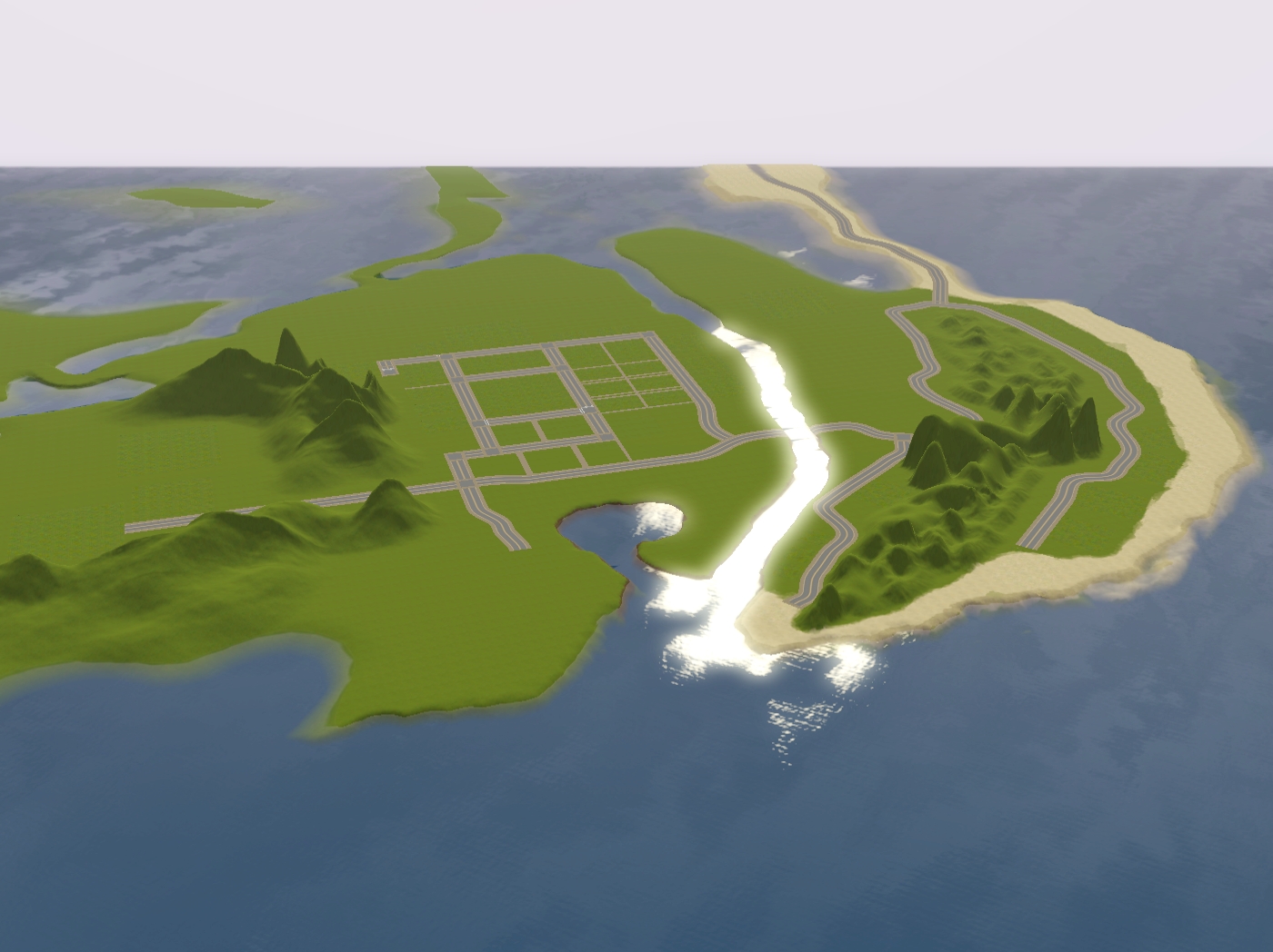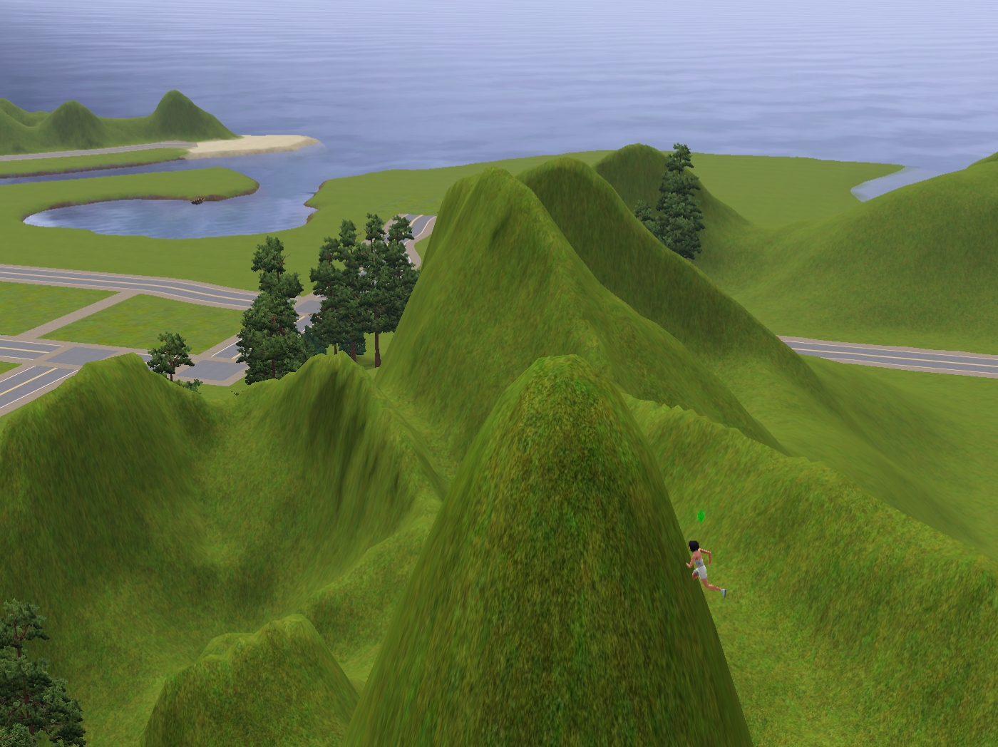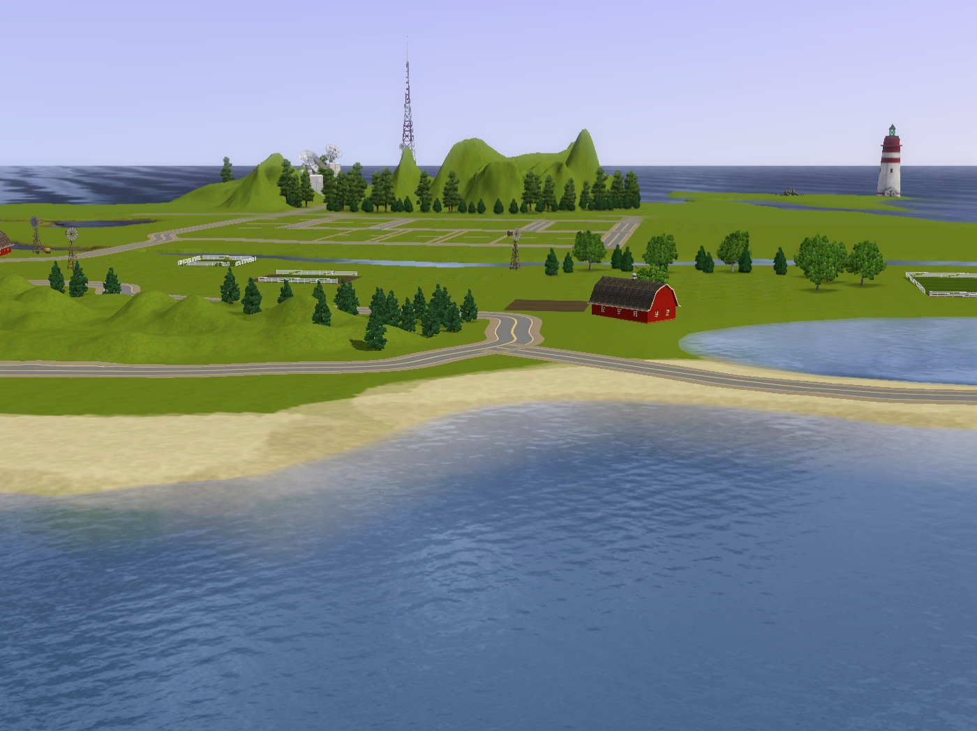 ...so now the lots are over the terrain..you can't actually see where I've placed them because for some reason you can't take a screenshot in edit mode..pah..anyway, there's lots of varying sizes all along the beachfront, I've tried to keep everything standard sort of sizes so that I can plop EA lots in if I can't be bothered to make some of my own, or fab lots off here..I still can't figure out how to place a bridge and have the road useable...but managed to get the trees on and objects..and this is where I'm at now..
