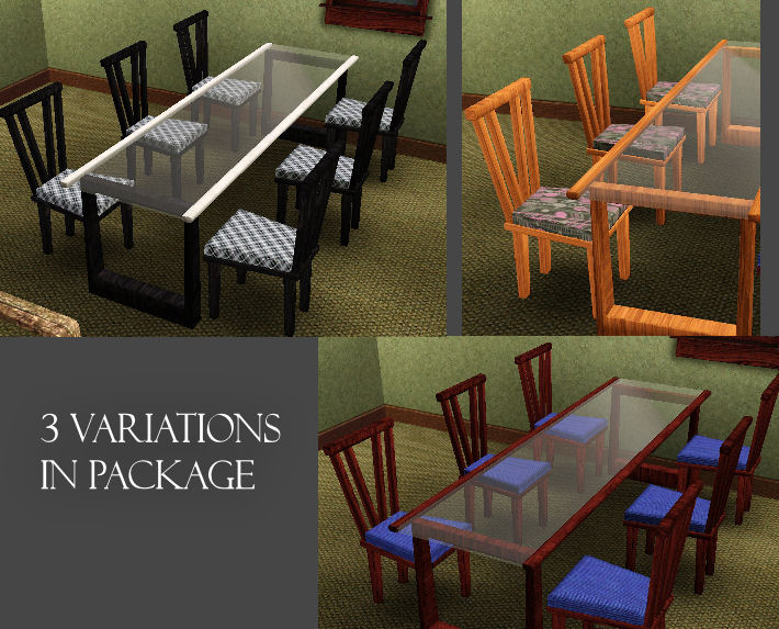 I've managed to solve the trouble I had with the chair. I have also 'redesigned' it and removed what was on the back of it. So now the table and chair is finished and there will be 3 variations in the package. The light wood will be the default.So here is another picture of the objects so far.