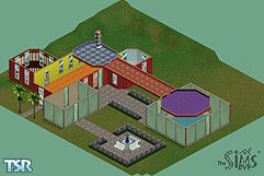 The design of this house is really eccentric. On the first floor the room with the red floor is a kitchen and the small with the blue floor is a bathroom. The glass-room can be used as a dining room. The room at the end of the glass-bridge, above the pool is the bedroom.