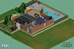 A two story house, with the second story over hanging the first story at the front, with two balconies over hanging, held up by collumns. A small flower bed lies to the right of the front door, with two dolphin hedges lying in the middle. A pool is to the left of the front door and contains a llama hedge on a small island inside the pool radius. Also with the pool, comes a porch complete with a grill and hot tub for four.