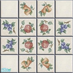 Apple, pear, plum, floral tile, with blue or cream paint and matching tile plus linoleum for a kitchen.