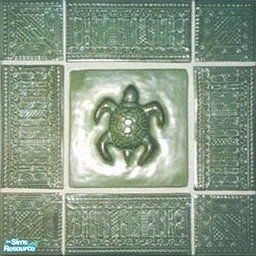 A green glass tile with an embossed turtle, by wyldsyde flooring.