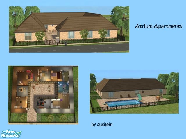 A simple two unit apartment with an atrium. Community area with pool and barbecue.