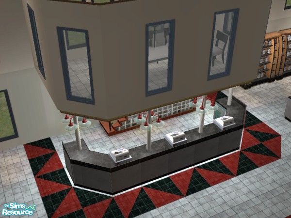 Now your Sims can enjoy the convenience of one stop shopping for electronics. This lot features cell phone kiosks, video games, and a TV and stereo "department." There is also a unique sales counter area, and a small second floor office.
