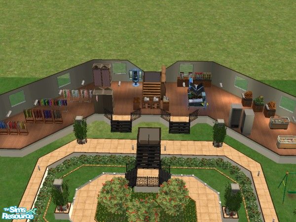 This lot has just about everything your Sim could ever need. Clothes, computer/arcade games, food, and electronics. There's also a gymnasium on the top floor - no excuse for not working out now! Outside there's swings and picturesque gardens for the Sim who prefers more of a sedentary lifestyle.