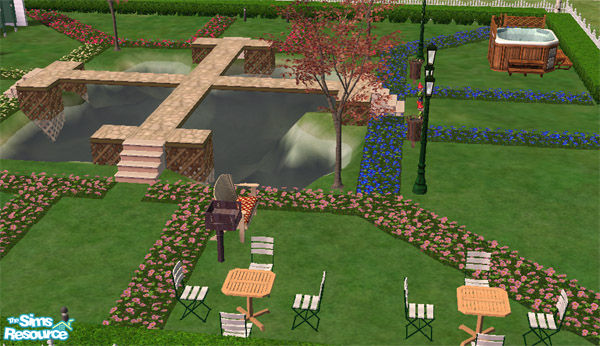 A beautiful flower garden for your sims to chill out in! There's BBQ, swings, a hottub and some toilets ofcause ;)You'll also find a lot of colourful flowers and a bridge over a little pond, Enjoy!