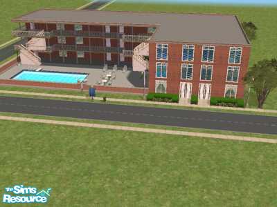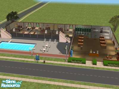 3 story, 9 bedroom hotel with restaurant, gameroom, pool, and gym. No hacks or custom content. Rooms include minifridge, microwave, coffeepot, and big screen tvs.