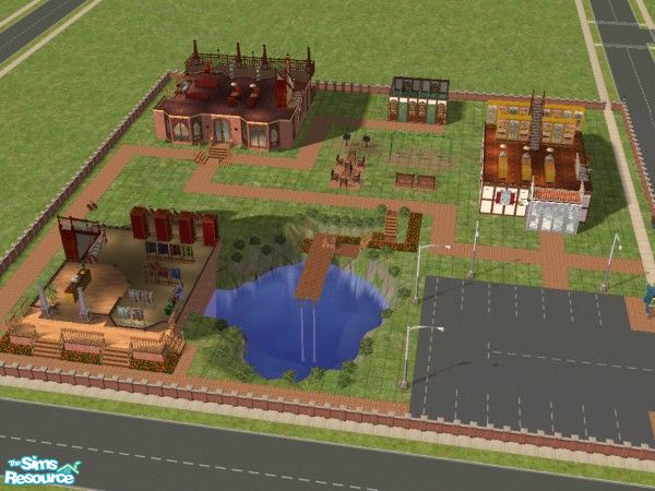 This is the "center" of town that I use in my main neighborhood. The idea behind it was to make it look like 3 old tutor-style houses that were converted into commercial spaces. There is a grocery store, clothing shop, game/magazine shop, and a lounge/meeting type building.
