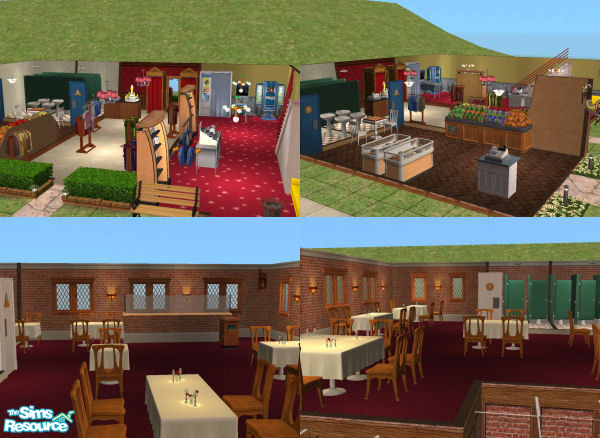 These three small shops have everything your Sim needs, plus the upstairs features a posh restaurant. Stores include a grocery store, a clothing boutique, and an electronics store with pinball and a photobooth. No hacks! Requires Nightlife.