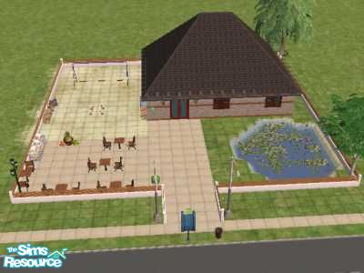 This is a park with pond, swings and kids games. It has a little party table outside and some table and chairs inside and outside.