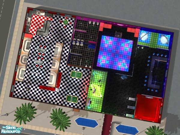 A nightclub and diner in one, with a few bonuses. ;) Features: restaurant, dance floor w/ DJ booth, 2 dance spheres, band instruments, TV, Pool Table, Poker, Bar, Pinball, Electronics Kiosk & showers. Trust me, Sims can spend hours here! NO HACKS OR CUSTOM CONTENT!