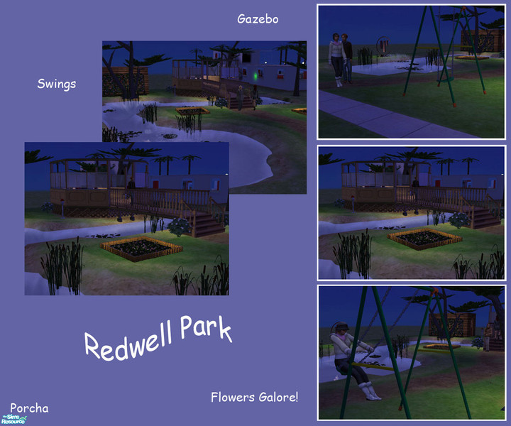 A small but beautiful community park, the perfect place to relax after a hard day. With a gazebo, pond, swings and some hidden atmosphere lighting for that special romantic midnight stroll, your sim is bound to have fun here! *Part of the Redwell series*