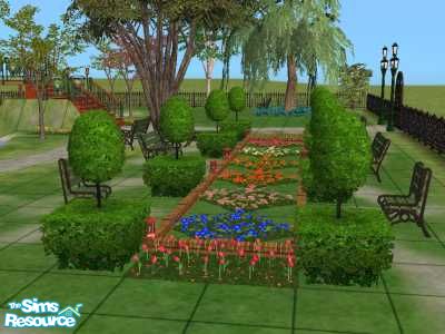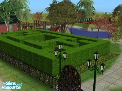 For Community Gardens competition - Serendipity Gardens features pond with ornamental bridge, restrooms, al fresco dining area under pergola, maze, chess garden, sculpture garden, formal gardens, and outdoor theatre. Custom objects from The Sims 2 website.