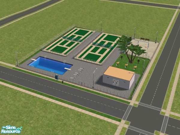 A pair of Tennis Courts for your Sims to wander around on. It comes complete with some grills, a pool, and bathrooms!