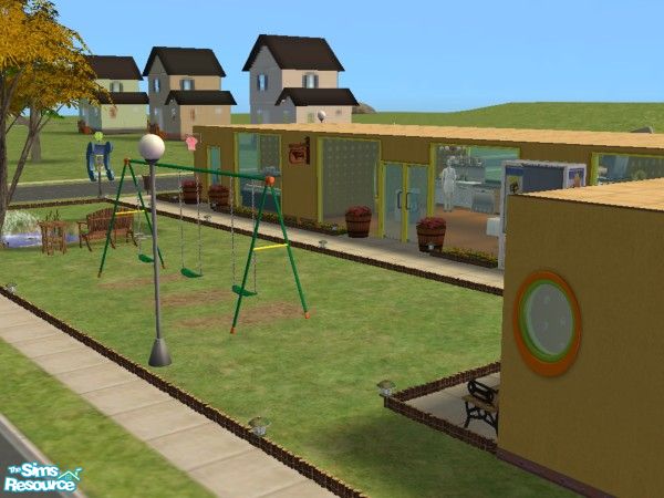Small shop I created for my Uni students. Clothes, groceries, diner, small pond for fishing, and, of course, a swingset. No cc/hacks.
