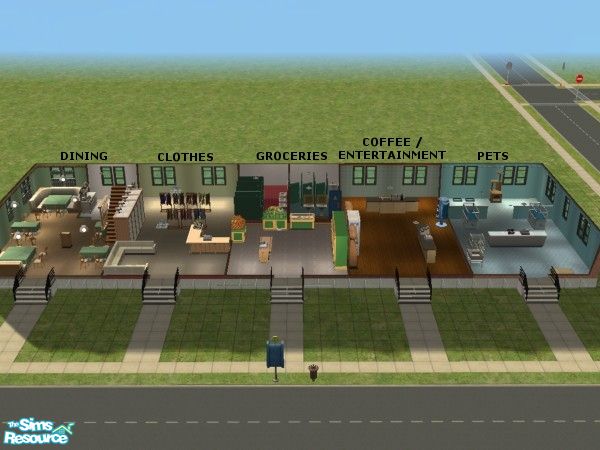 Shopping center with dining, clothes, groceries, coffee, entertainment and pets. No custom content.