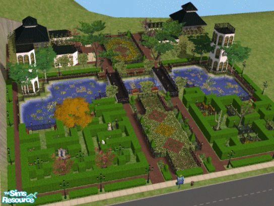 Twin lookout towers preside over lush gardens, a walking path, several romantic hideaway grottos, architectural flowerbeds, a lily-filled lagoon, and two hedge mazes that showcase artwork and botanical specimens. Facilities include two picnic gazebos, four bathrooms, and swingsets.