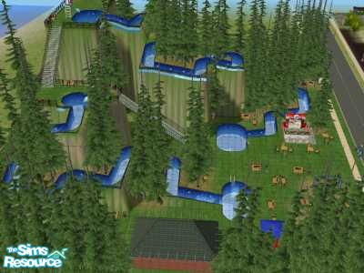 My second park Waterland is nestled amongst towering pines and offers your Sims an adventure with two waterslides that twist and turn! It also includes dining and picnic areas, a playground and restrooms with showers. (Special thanks to ad27 for Building the Best Pools and Waterslides tutorial.)