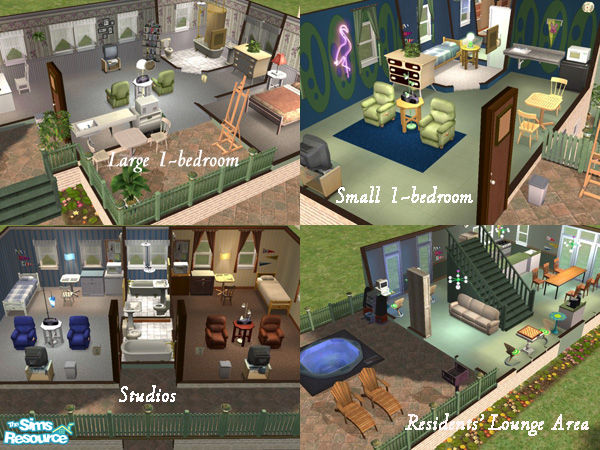 Sims can live together but with separate apartments! Apartments: 2 lg 1-BR (dbl beds), 2 sm 1-BR, 4 studios;all have kitchenettes,private baths. Residents' lounge area w/kitchen,dining,games,music,gym,hot tub. Hack free, no custom content. Also available as dorm lot.