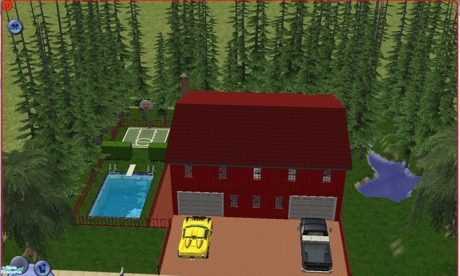 Located in a wooded area this house is for the sim who loves to tinker The entire 1st flor is a 3 car garage w/broken down cars & tools! Upstairs consists of 2 bedrooms, 1 bath, a lg kitchen & a livingroom + sittin area w/fireplace at the top of the stairs! Outside is a pool & basketball court! Enjoy