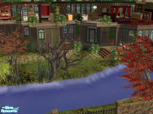 Thanks to the wonderful artists at TSR, the 7th home in my series of homes connected by the winding river looks old and worn. This home has a family/game room, exercise room and spacious grounds with some of the Bon Voyage toys for your Sim family to enjoy.