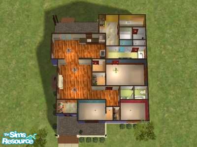 434-4 type, three bedroom, 2 1/2 bath. An open floor plan for the living, dining, and kitchen. There is a pantry just off the kitchen. The powder room is just outside the kitchen. All Maxis original content.