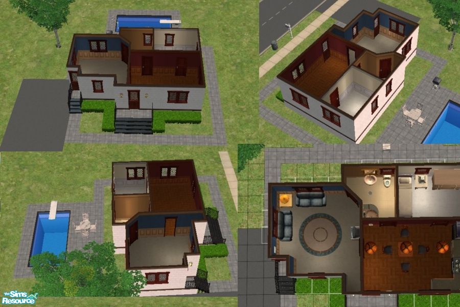 A small starter home made for one, possibly two sims. It has one bedroom and one bathroom, kitchen/dining room, and a living room. The inside is unfurnished but the outside is equiped with a drive-way, a swing, a pool, BBQ grill and a table for four.
