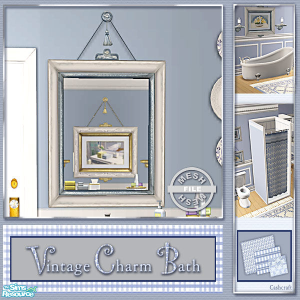 A bathroom set to match the Vintage Charm Bedroom. The set features blue and white textures. Most of the set\'s furniture is linked to the Vintage Charm Bedroom dresser. You MUST have the dresser installed to use these 6 new meshes, hutch, sink, shelving, 3-drawer chest, console and medicine cabinet.
