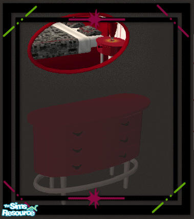 Red modern metal bedroom set made of highly polished and painted simluminum. Durable set only needs a good dusting every once in a blue moon to maintain its beautiful sheen. Includes 6 new meshes by me. Pleas note, the dresser is NOT animated. I haven't figured out yet how to do that. The sims will still act like they pull a drawer out, but they don't.