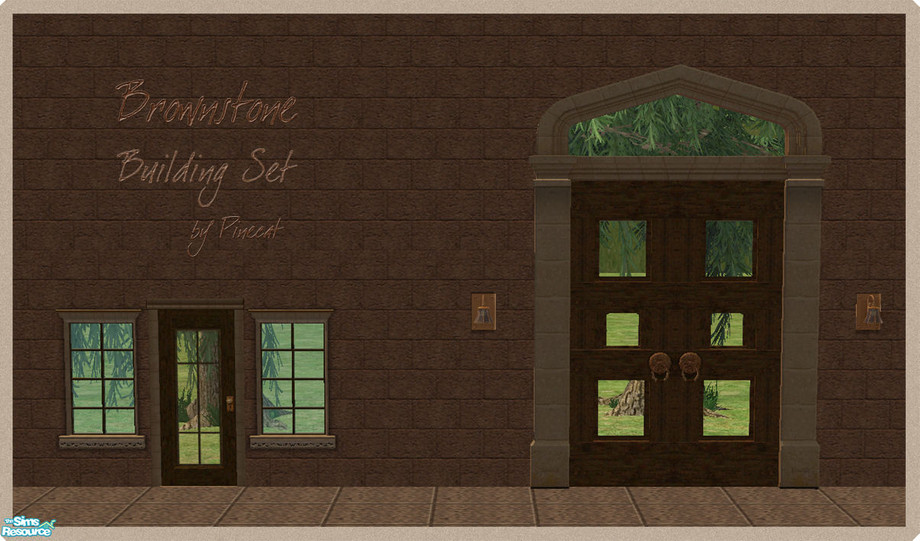 Two-story, three-tile door with glass panels,wood frame and carved stone moldings. Recolor of Maxis 'Hey Nonny No Door'