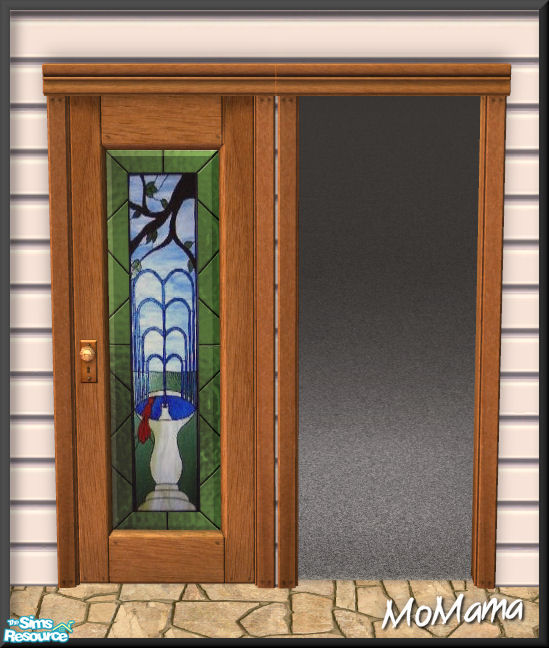 A fountain against a blue sky surrounded by a green frame all of fine plate glass is framed by a sturdy door in natural walnut. Comes with matching arch.