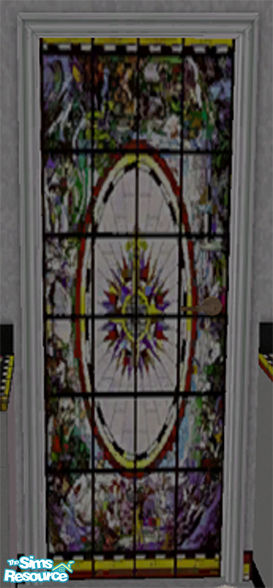 This lovely dining room uses the light to exploit the unique stained glass textures throughout the room. A "must" for all Sims! This is the lovely stained glass door