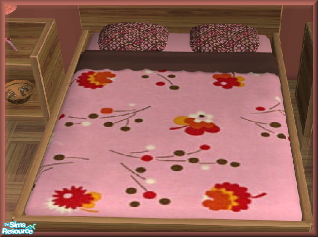 A pink mattress is topped by a pink flowered quilt and a brown sheet. The pillows are encased in a brown fabric with pink pattern.