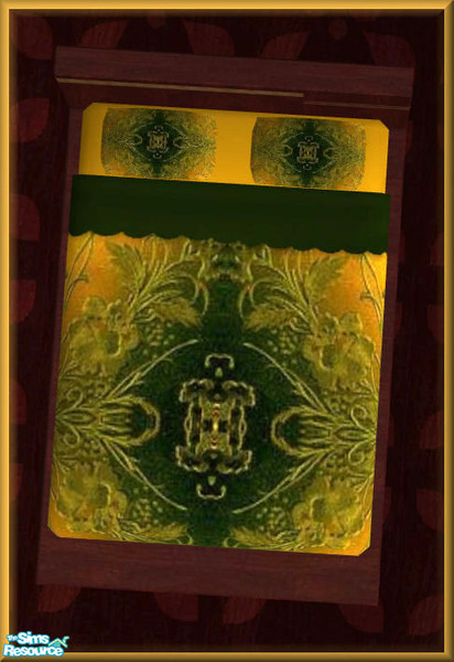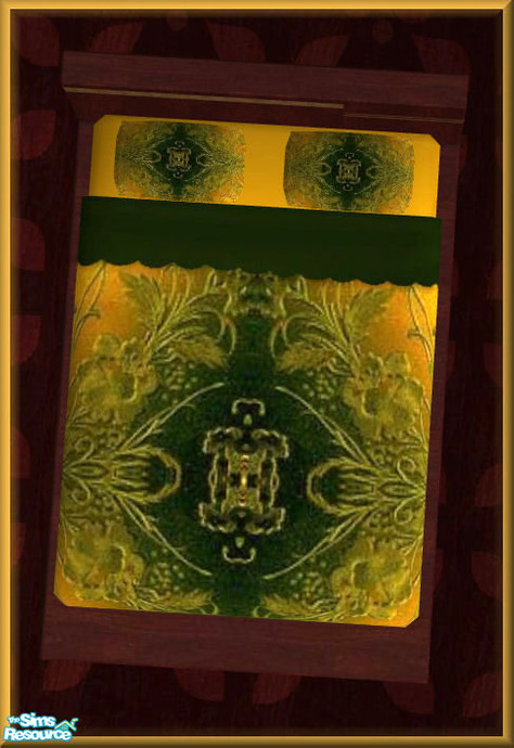 A green and gold quilt covers a gold mattress and dark green sheet and is topped by matching pillows.