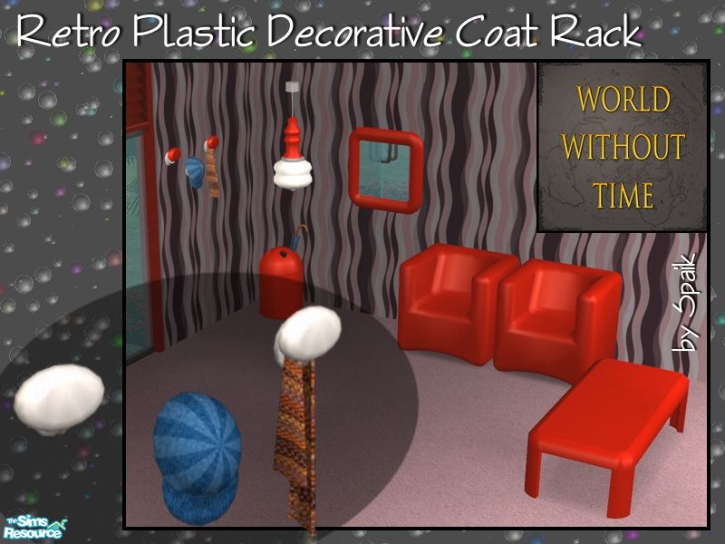 This decorative coat rack in perfect cheap retro style is part of the Retro Plastic Hallway. The mesh borrows the texture from OFB \"Just Corner Shelves\" and can be used to complement a shop too. It\'s available in all the colours you have for the Maxis shelves.