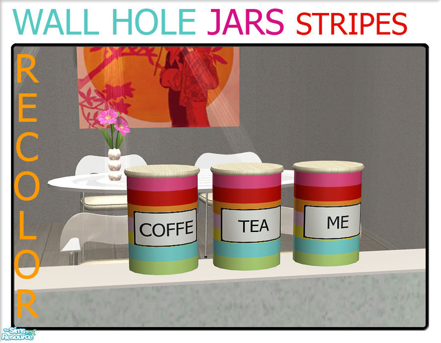 A set of recolors of the jars from my wall hole knick knack set. Use it on the Wall Hole shelf or just for general decorative use ;)
