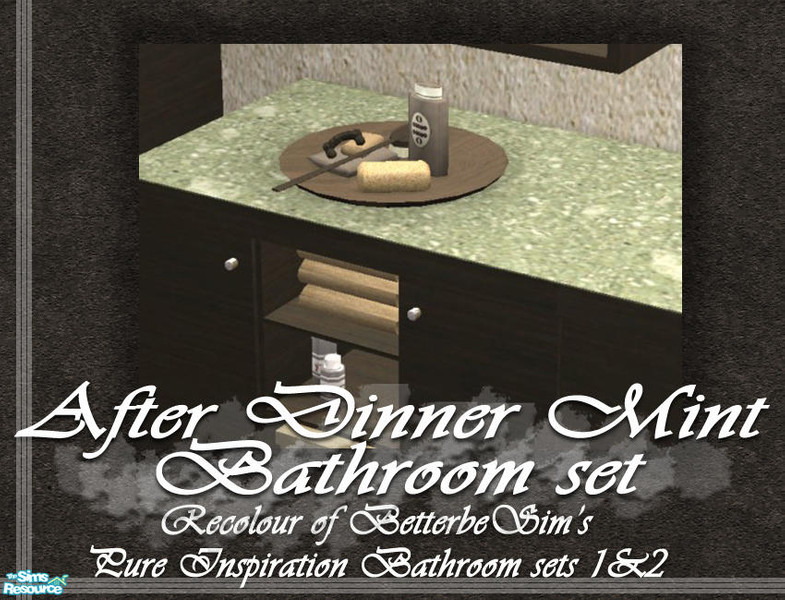 Recolour of the brilliant BetterbeSim Pure Inspiration bathroom sets 1&2. Please download these meshes for this set to work. A dark wood with green granite bench tops. Walls and floors by me (also available), screen and plant by BetterbeSim. Enjoy.