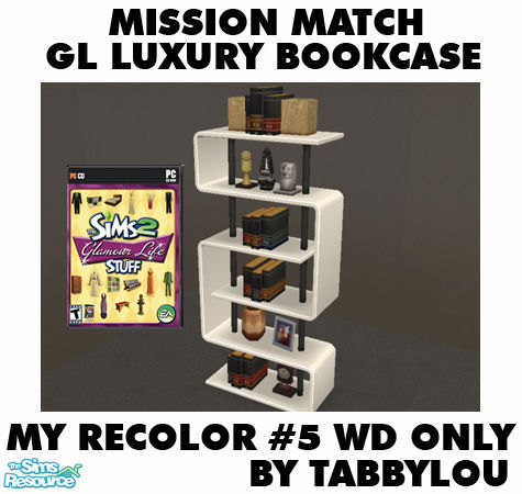 My Recolor #5 Wood ONLY for Recolor of Glamour Life Luxury First Class Book Shelves to match the mission style furniture woods & my wood recolors. This set includes wood & support recolors. Request by lupusdragon. Requires Glamour Life Stuff Pack. Enjoy!