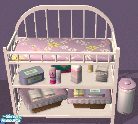 Has a purple changing pad with flowers on it.