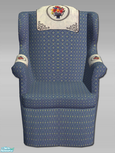 Part of a recolour of my Hallway Set, with White wood finishes, Blue fabrics, embroidered doilies for the Armchair and Table and lots of variety for all the deco pieces.