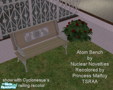 Part of the Summer Fun Park and Grilling Objects set. This is a light wood and white iron recolor of the Atom Bench, the one with the dog and cat on it and bone armrests! It does Require the Pets Expansion Pack. Look for the rest of my Summer Fun set!