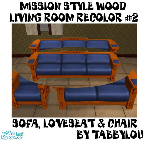 Sofa, Loveseat & Chair in Recolor of Maxis Mission Style Living Room Furniture in sort of a light walnut. Enjoy! (Working on rest of rooms, when done will also recolor all Simaddict99's nursery match mission items.) Required OFB. File recolors all three!