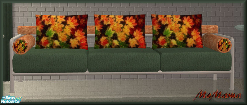 A sofa with green bottom cushion, gold back cushion and leafy pillows.