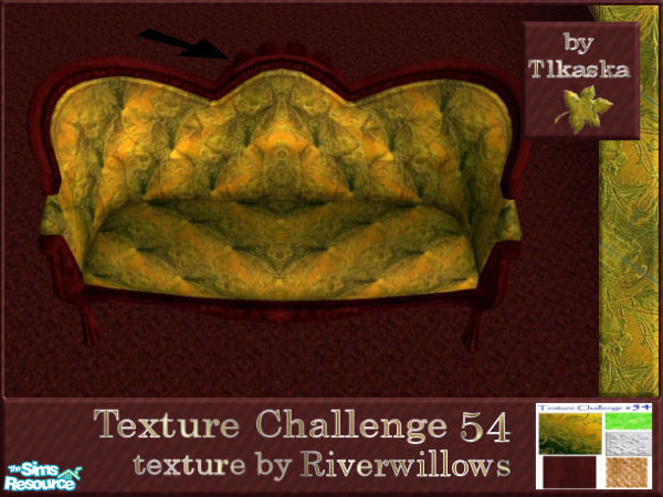 This elegant dark wood furniture with green accents was designed for Texture Challenge 54. Set includes: Sofa, table, chair, curtains, bowl, ceiling and wall lamps, hanging and floor plants, carpet, wood floor, and a white textured wall with dark wood wainscotting.