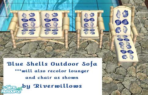 A lovely sofa in a blue and white shell pattern. This file will recolor matching chair and lounger as well. Part of the Blue Shells Outdoor Set and made for Marine Theme Week, by Riverwillows
