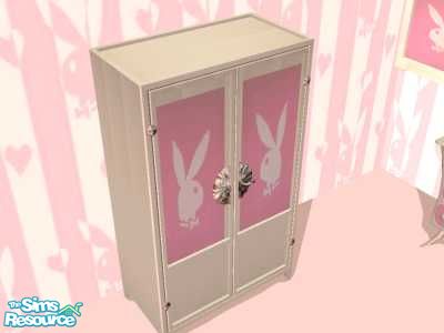 A pink wardrobe with a white playboy bunny on the doors. Matches the pink playboy bedroom set.