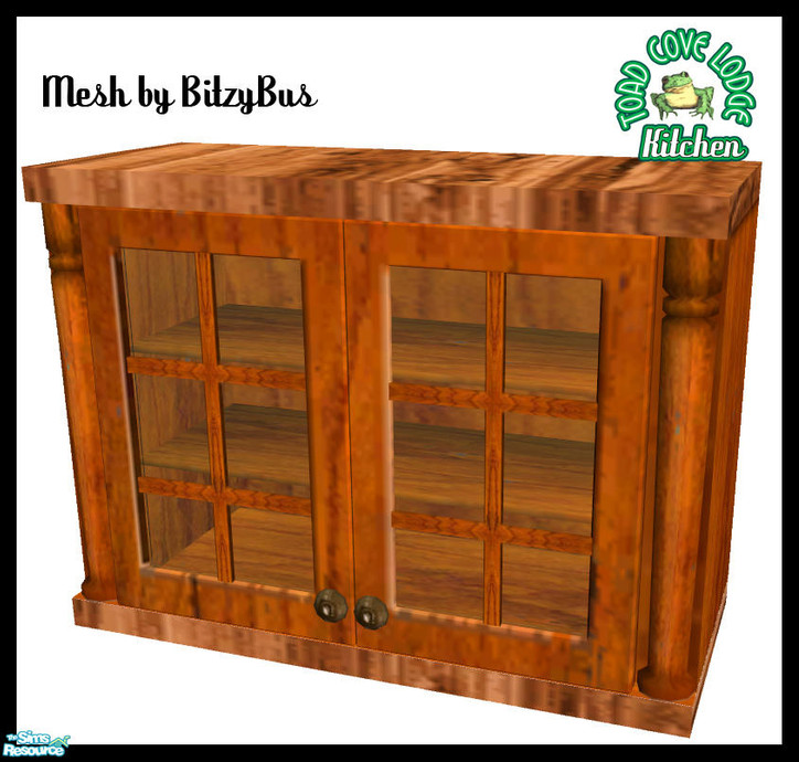 Dark wood and glass upper cabinets. You'll want to check BitzyBus's minisite for the dishes, mugs, etc, that fit in these cabinets!