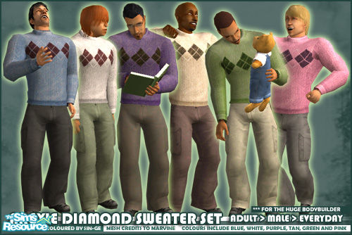 A warm sweater with an argyle diamond design for the Huge Bodybuilder. Five different colours: blue, green, white, purple, tan, and pink. Recoloured from Marvine\'s Sweater and Pants mesh.